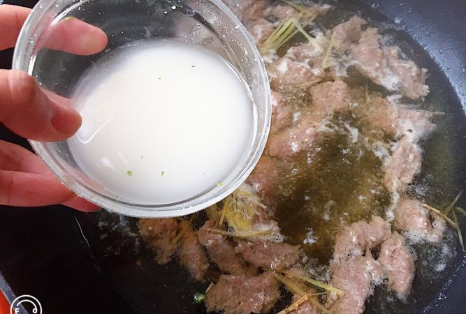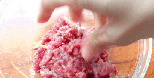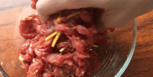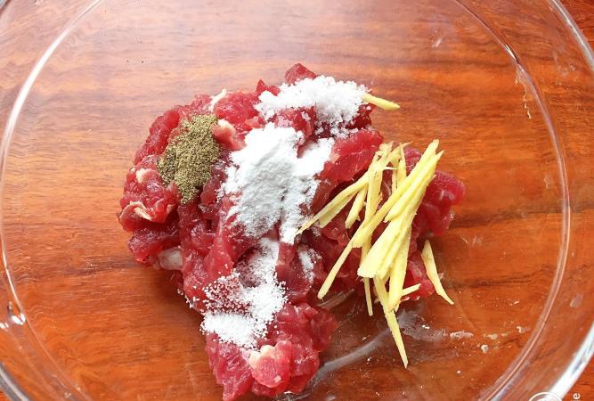 醃製牛肉時,加黑胡椒粉、鹽、雞精、生薑、生抽,還有一點點小蘇打,用手反覆抓取均勻混合入味,使各種配料更好地滲入牛肉中。(♥♥--①小蘇打可以破壞肉質的結締組織,吃起來嫩滑鬆軟;②小蘇打用量一般是500g肉搭配5g小蘇打,不要加太多,以免影響肉質口感)。