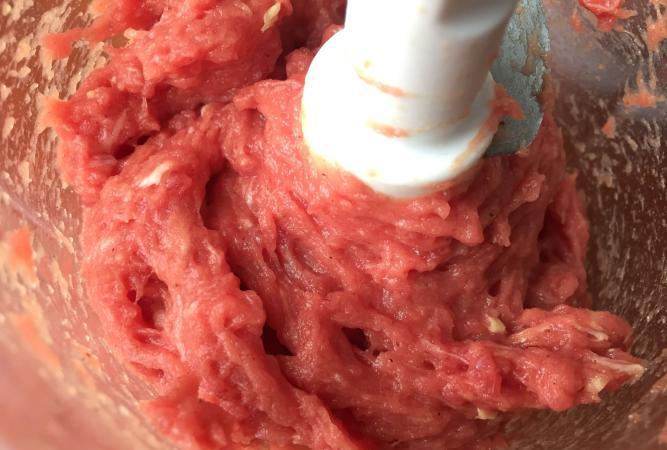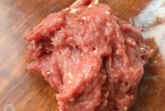 像我這樣比較懶的,直接將醃製好的牛肉放入料理機中,攪成泥。也可以用刀背將牛肉拍打,使其組織鬆軟,再切成小塊,剁成泥。(♥♥--用刀剁成泥,醃製這一步得放在後面哦)