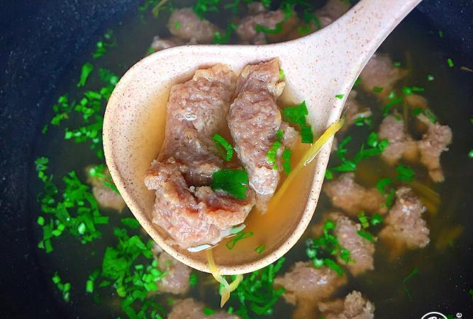 牛肉羹漂浮上來再煮半分鐘左右即可關火。加點蔥和香菜,香菜是必不可少,使牛肉羹聞起來更香;再加點鹽和胡椒粉調味,加入胡椒粉會使牛肉羹湯底味道更上一層,略微辛辣總能讓人食慾大增。