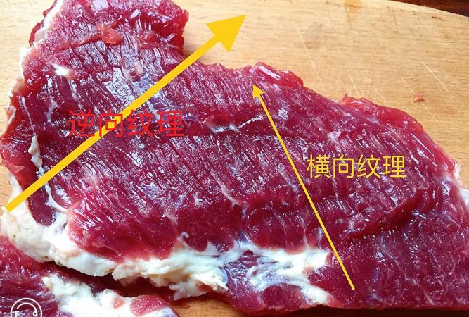 買來的牛肉是像這樣一整塊的,就先將牛肉切成薄片,然後觀察牛肉的紋理,切的時候不要順著紋理切,而是要逆著紋理切(如下圖所示)▼。