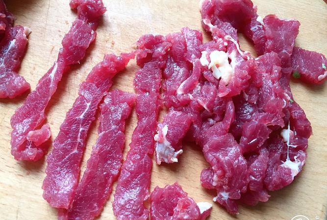 將牛肉切成細長條,至於切寬切細,可以根據個人的喜好調整。(♥♥---逆絲切使可以使牛肉纖維被切斷,就口感爽嫩不少了,醃製的時候會更好入味;如果順著紋路切,筋腱會保留下來,煮熟後咀嚼不爛。)