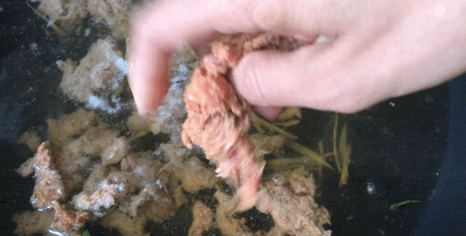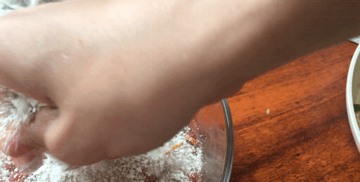 往肉泥中加入適量的地瓜粉,地瓜粉一定要先抓取捏碎成細末狀,用手反覆抓取使地瓜粉和肉能夠充分融合在一起,直至看上去只有肉色,而沒有看到地瓜粉白,這時候就完成了。(♥♥---①地瓜粉與肉泥比例控制在0.8—1左右;②如果抓取過程覺得粘手的話,可以用筷子往同一個方向反覆攪拌,攪拌至完全融合即可)