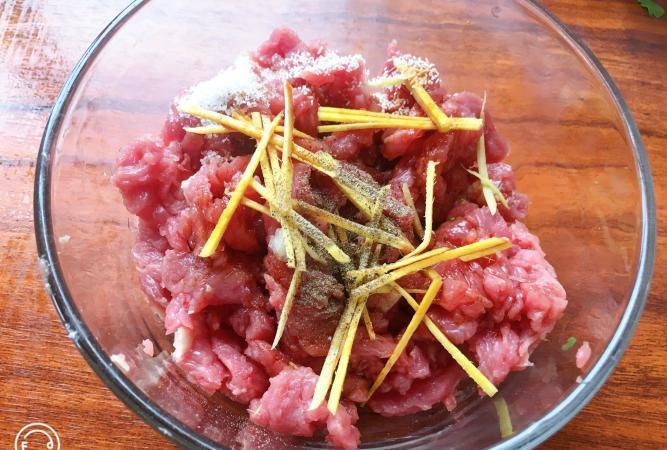 牛肉、地瓜粉、姜、胡椒粉、鹽、雞精、生抽、蔥、香菜