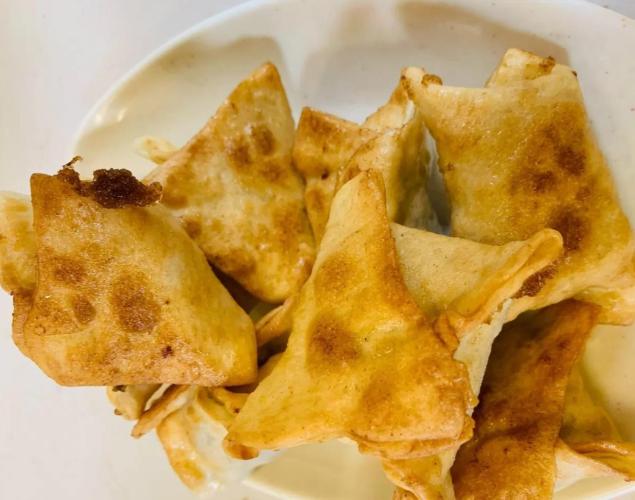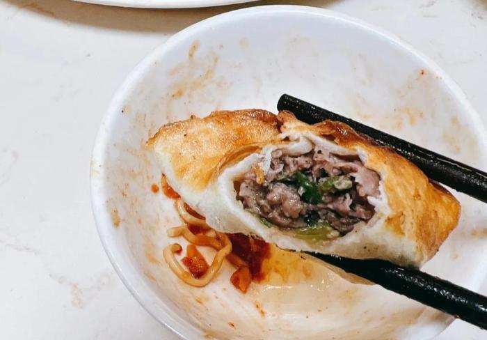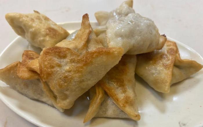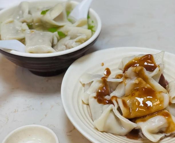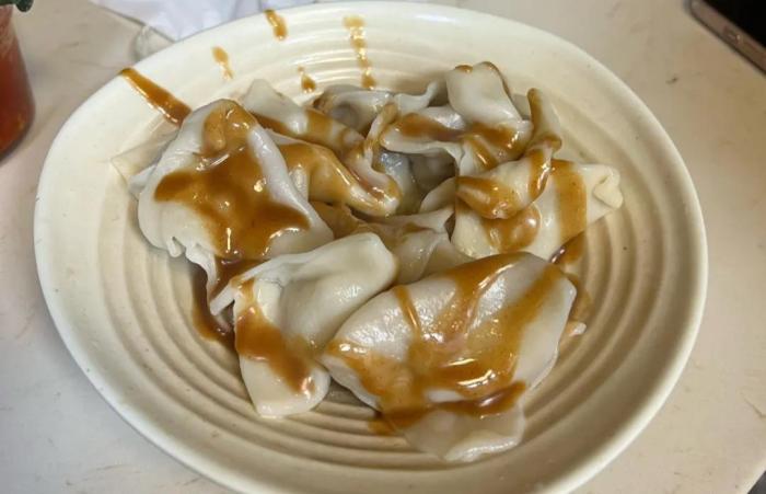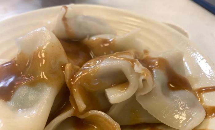 第一,牛肉乾餾餃,這種餃子就是把牛肉餃煮熟幹撈起來,上面撒一層沙茶醬,吃起來爆漿,裡面的餡很緊實,裹成了一個丸子狀,配上沙茶醬別有一番滋味。